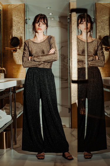 Le Body Flamboyant redéfinit le glamour avec une touche de confort. Confectionné en maille élastique dorée pailletée, ce body à manches longues enveloppe le corps avec douceur tout en offrant un scintillement subtil. Son col bateau met en valeur la silhouette avec élégance, et l'ouverture en forme de O au dos ajoute une note séduisante. Idéal pour briller lors de vos soirées ou comme sous-vêtement luxueux au quotidien, le Body Flamboyant combine parfaitement style et aisance.
