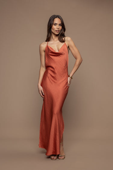 The Gala Dress is a masterpiece that combines sophistication and allure. This long dress, draped in a terracotta-colored satin fabric, features a cowl neck and back for timeless elegance. It ties delicately at the neck for a perfect fit and gracefully highlights the nape of the neck. The side slits invite movement, bringing a touch of lightness and sensuality to every step. Perfect for gala evenings or any event where chic is the order of the day, the Gala Dress promises a remarkable, refined presence.